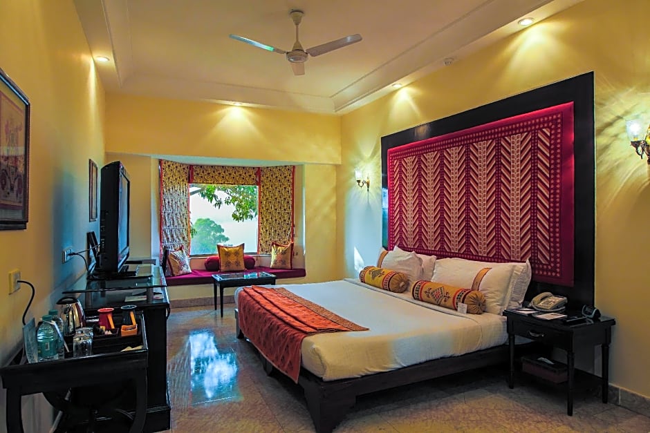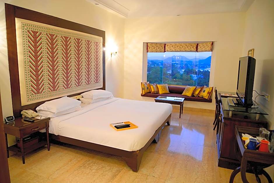 Spacious room features a separate dining area, a 42-inch flat-screen TV, and a bathtub. It offers a panoramic view of the hotel’s sprawling gardens, Udaipur skyline and Fateh Sagar Lake.